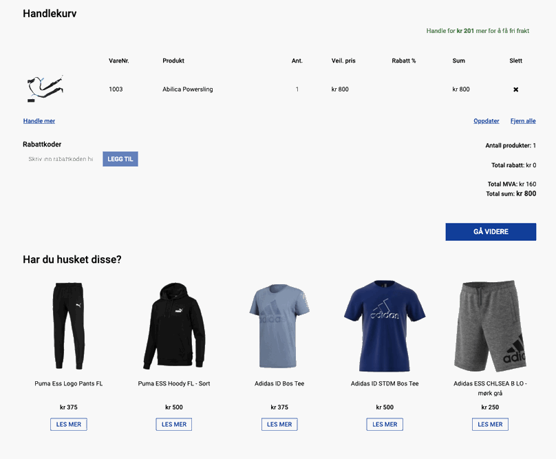 Når du for eksempel handler treningsutstyr i en nettbutikk, er det stor sjanse for at du også kanskje kan bli fristet til å kjøpe noen nye treningsklær eller annet tilbehør. Som nettbutikkeier kan du tilrettelegge for at gjennomsnittsbeløpet på ordrene dine øker, ved å benytte deg av produktlister i nettbutikkens handlekurv. Da er det lurt å lage lister med spørsmål som "Har du husket disse?". I kombinasjon er det også veldig smart å implementere en fri frakt indikator - som også kan motivere kunden til å heller handle mer, heller enn å betale frakt. Dette er tilpasninger som kan gjøres i alle nettbutikker hos oss, med forutsetning om høy nok systemversjon. Om du er interessert i å gjøre noe slikt i din nettbutikk, ta kontakt for en uforpliktende prat, så tar vi en gjennomgang av nettbutikken din sammen, og ser på hva som må til for å gjøre en slik tilpasning hos akkurat deg.