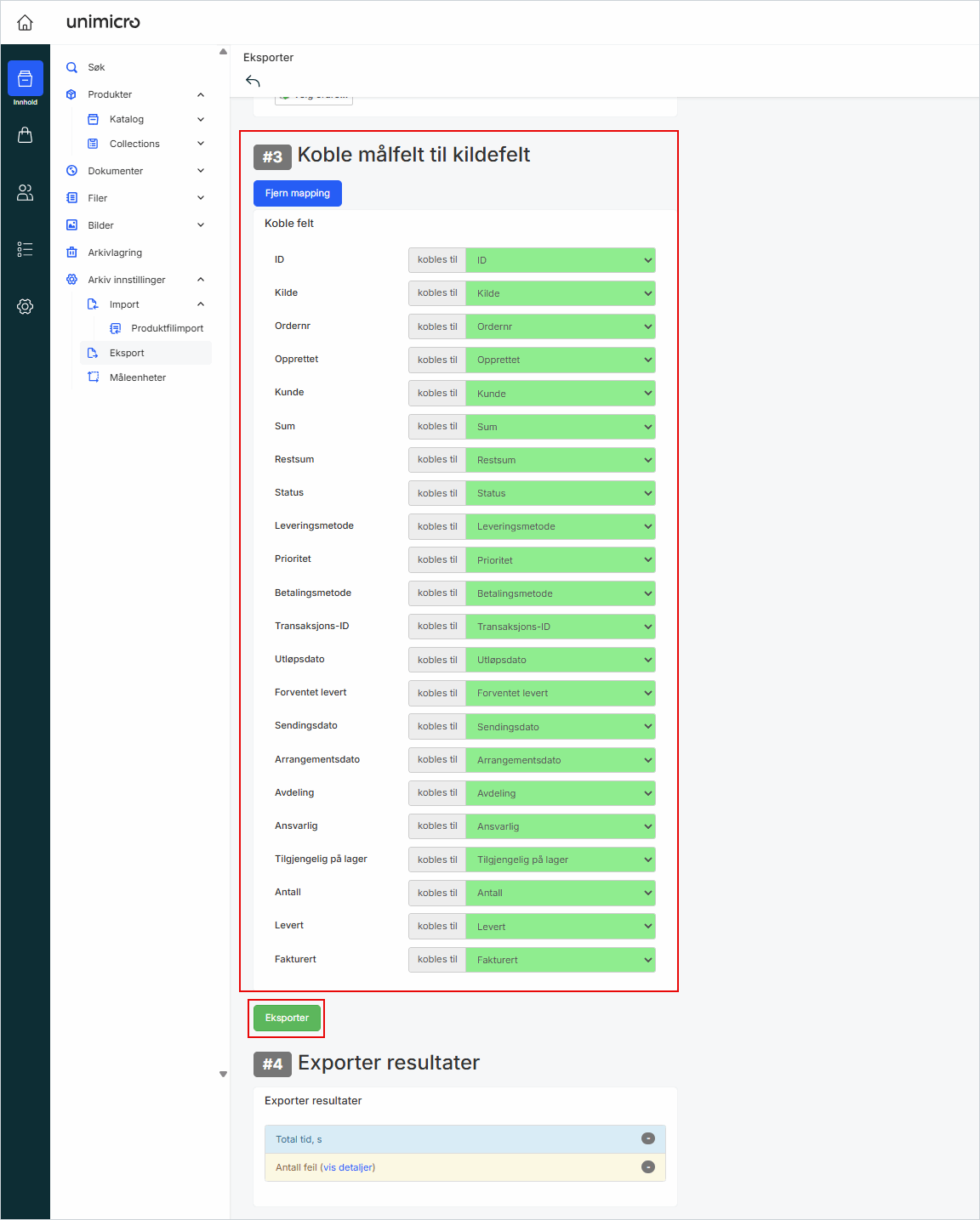Kontroller at hvert målfelt er koblet til korrekt kildefelt, for eksempel:• ID kobles til ID• Kilde kobles til Kilde• Ordrenr kobles til Ordrenr• Opprettet kobles til Opprettet• Kunde kobles til Kunde• Sum kobles til Sum• Restsum kobles til Restsum• Status kobles til Status• Leveringsmetode kobles til Leveringsmetode• Prioritet kobles til Prioritet• Betalingsmetode kobles til Betalingsmetode• Transaksjons-ID kobles til Transaksjons-ID• Utløpsdato kobles til Utløpsdato• Forventet levert kobles til Forventet levert• Sendingsdato kobles til Sendingsdato• Arrangementsdato kobles til Arrangementsdato• Avdeling kobles til Avdeling• Ansvarlig kobles til Ansvarlig• Tilgjengelig på lager kobles til Tilgjengelig på lager• Antall kobles til Antall• Levert kobles til Levert• Fakturert kobles til Fakturert