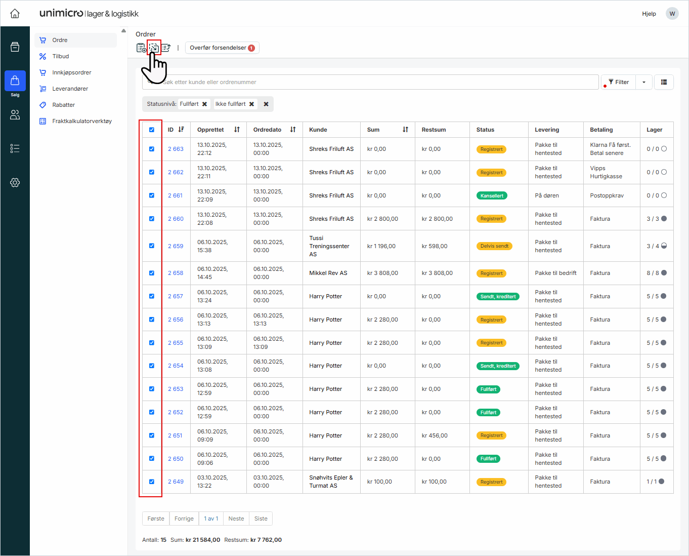 Du kan filtrere eller markere ordre ved å sette hake ved hver linje i ordrelisten