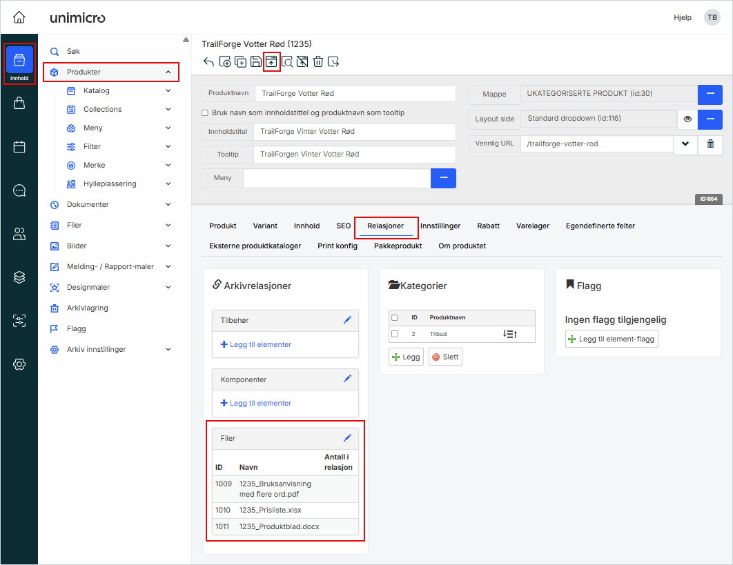 3. Gå til fanen Relasjoner. Her ser du alle filer som er knyttet til produktet.