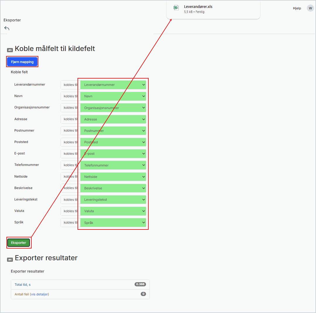 3. Velg kolonner som skal eksporteres - disse vises i grønt.