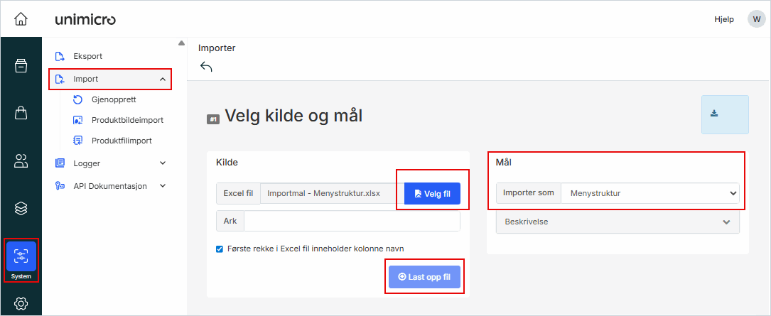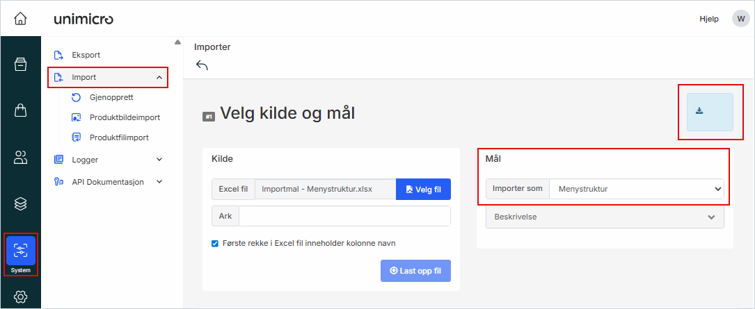 2. Klikk på pilen ved Importer som under Mål og velg Menystruktur