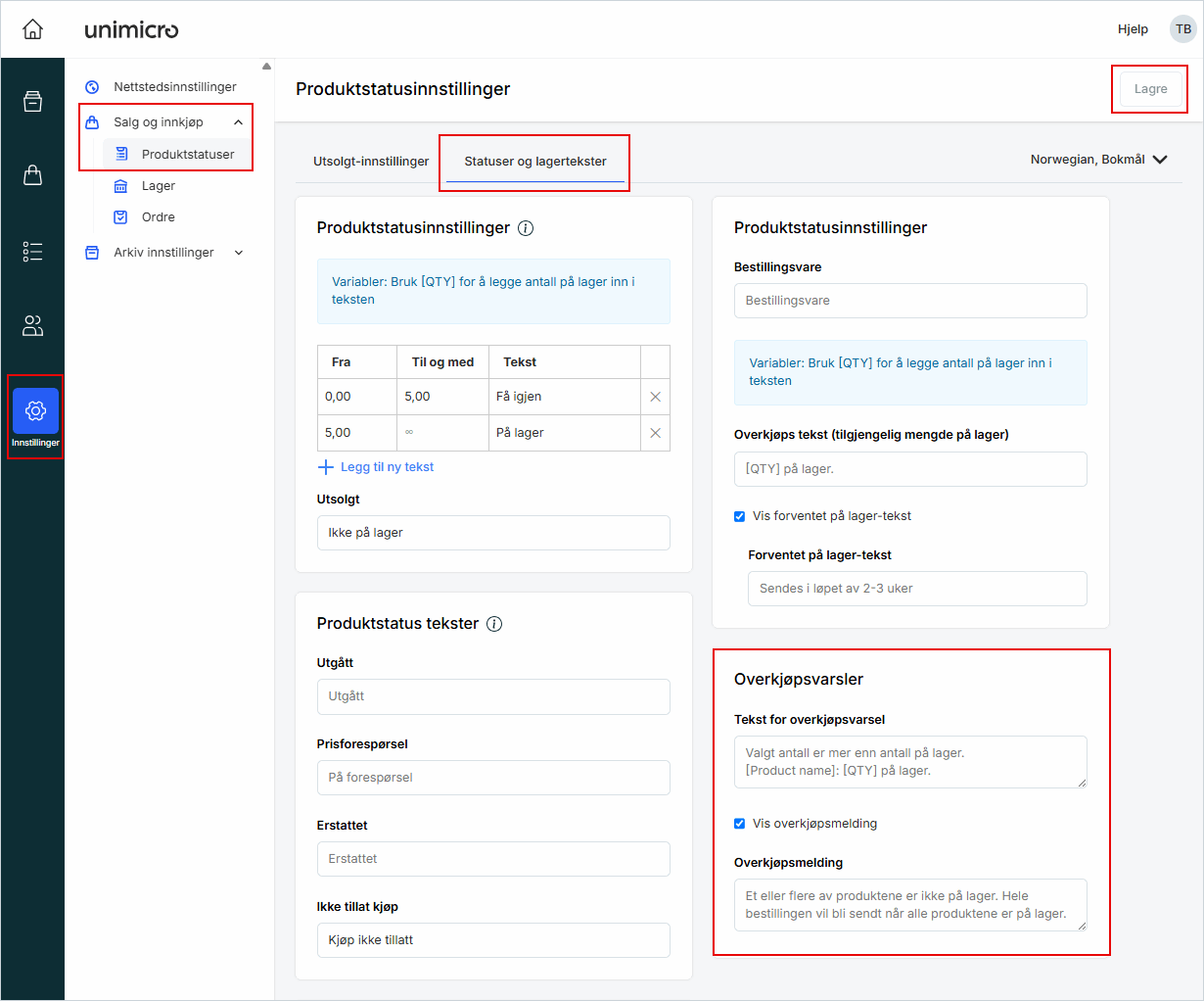Sett hake ved Vis overkjøpsmelding hvis du vil vise en samlet melding nederst i handlekurven