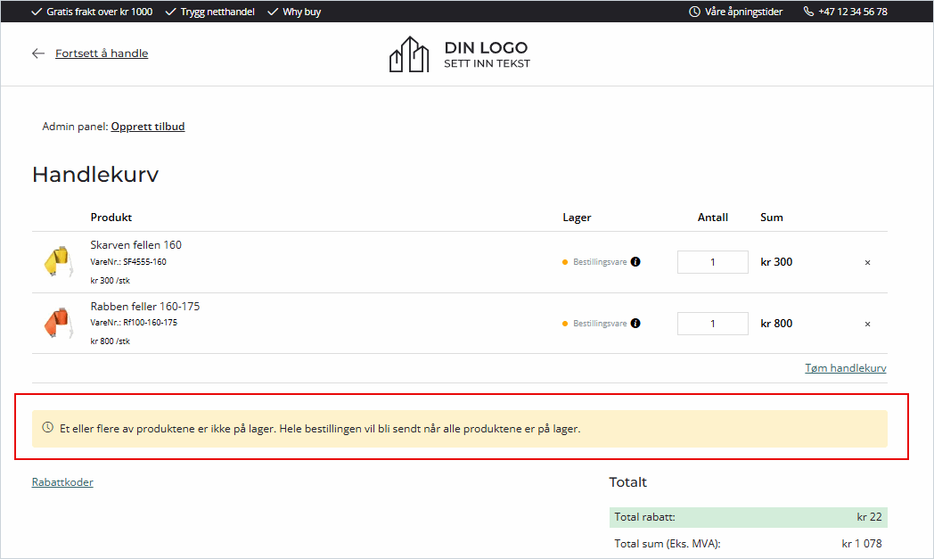 4. Sett hake ved Vis overkjøpsmelding hvis du vil vise en samlet melding nederst i handlekurven