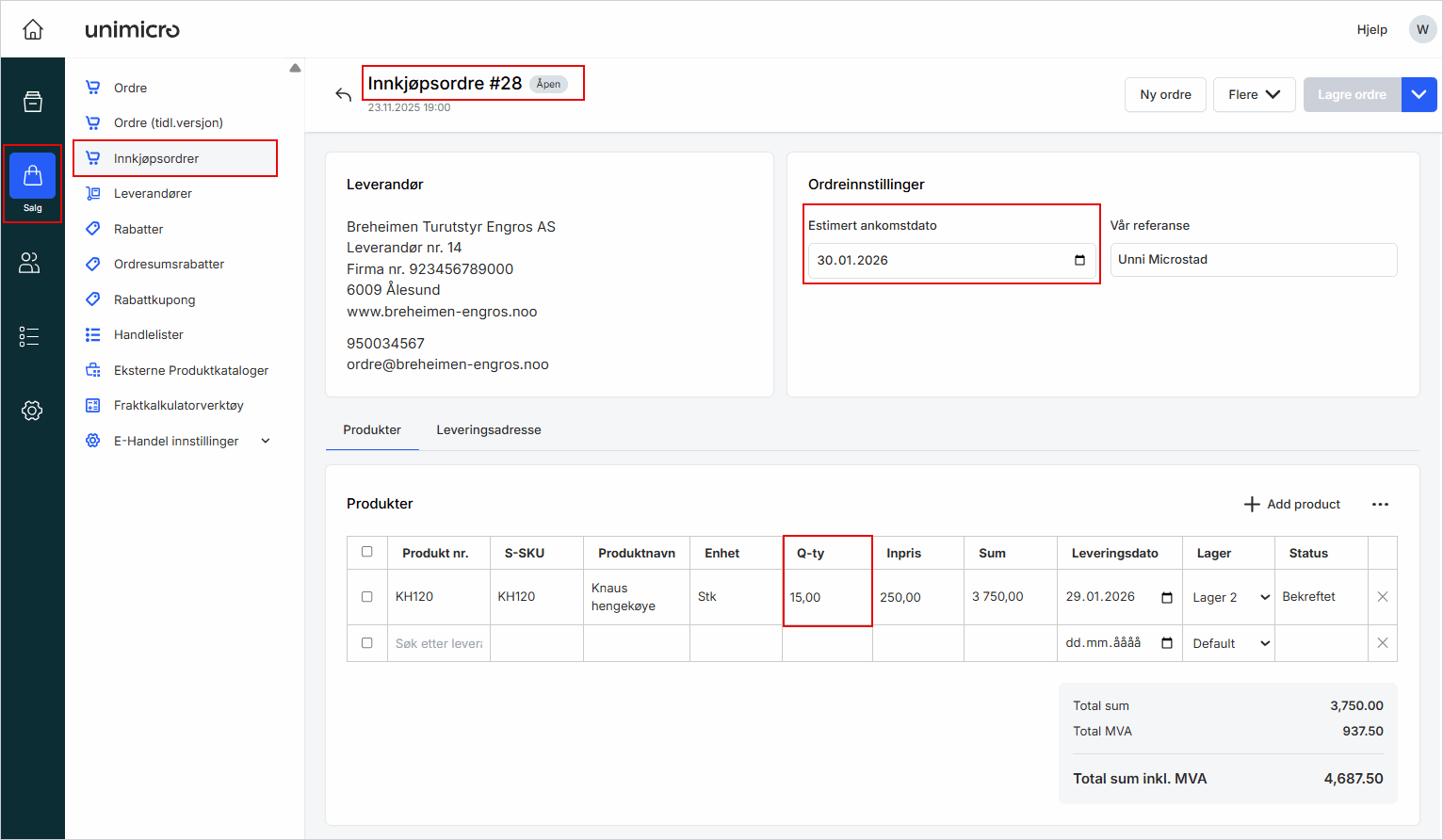 Innkjøpsordrer: Øverst ser du den tilknyttede ordren med bestilt antall og leveringsdato. Når innkjøpsordren er opprettet kobles den automatisk til produktet.