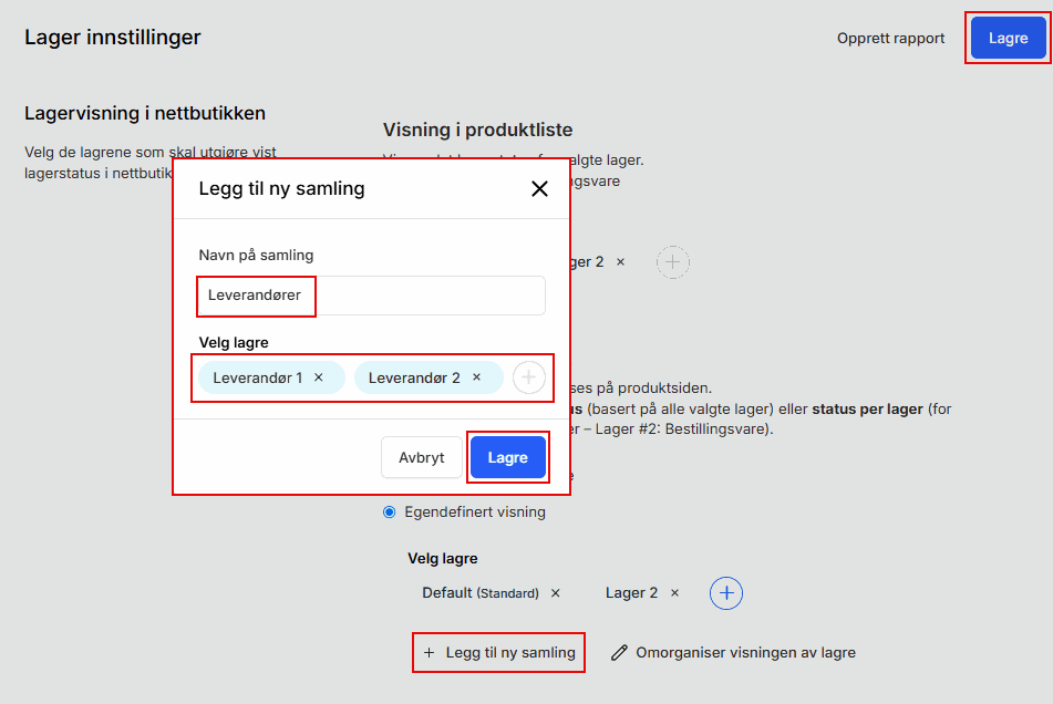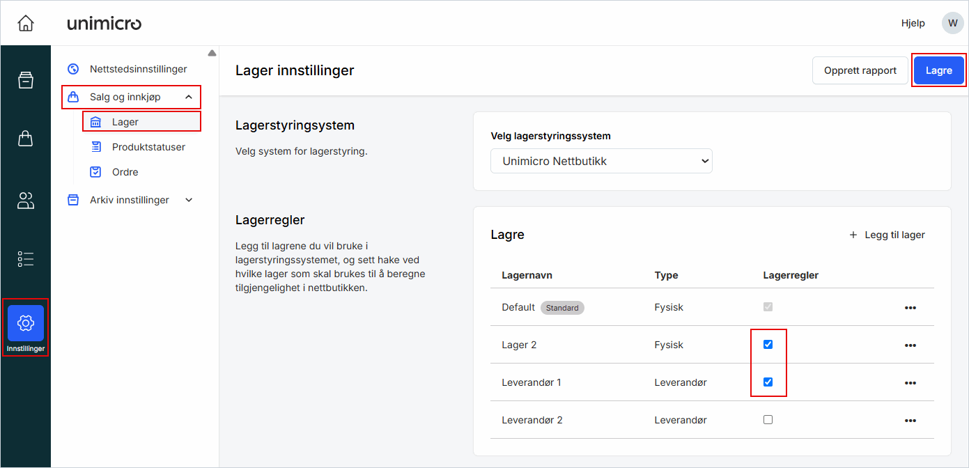 Her velger du hvilke lagre som skal brukes til å vise lagerstatus i produktlister. Hvis du skal vise status fra flere lagre, må du først sette hake ved alle aktuelle lagre under Lagerregler.