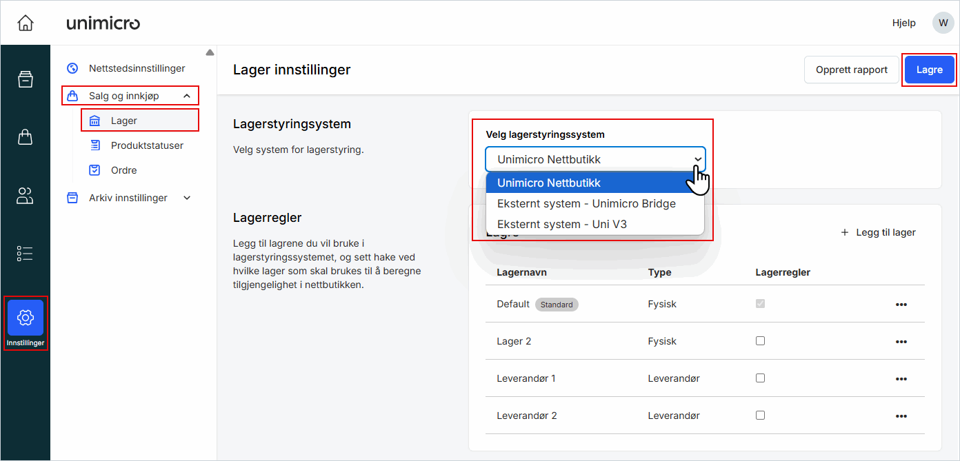 Hvis du bruker Unimicro Lager og Logistikk, må du velge Unimicro Nettbutikk som lagerstyringssystem. Dette valget gjelder selv om du ikke bruker nettbutikk, og navnet vises av tekniske årsaker.
