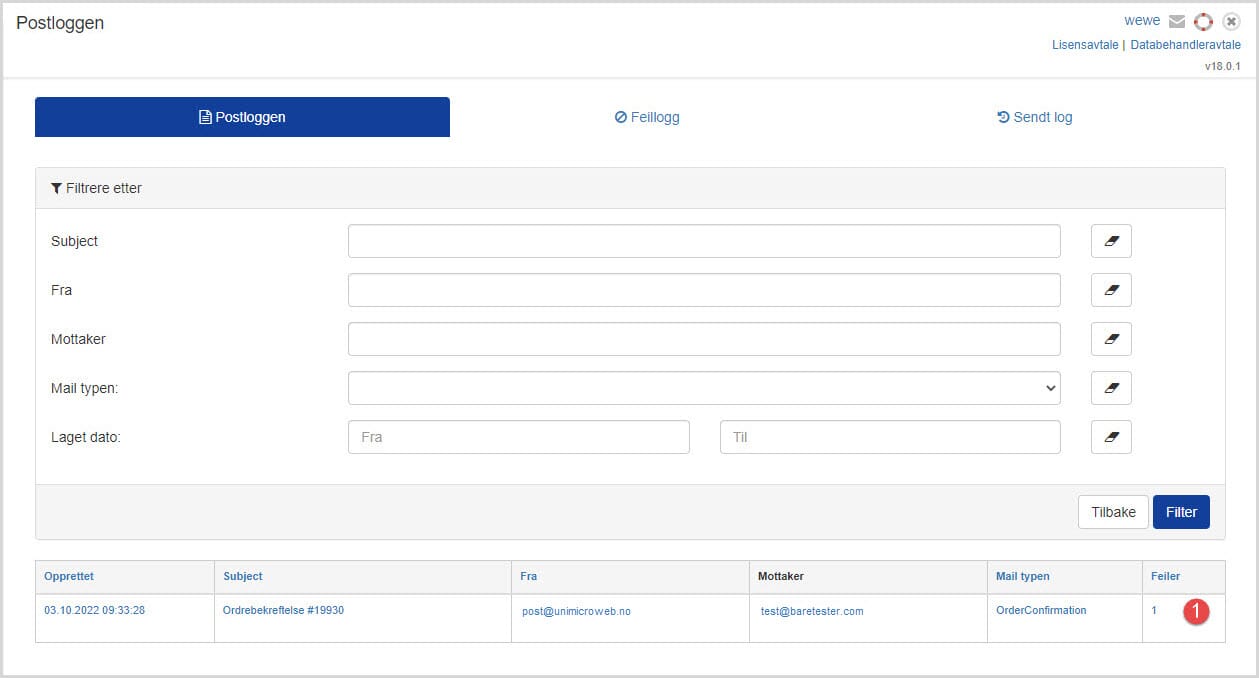 1. Gå inn på e-posten som har feilet - Dersom "Feiler" har status = 0, så er det ingen feil og e-post er levert. Dersom "Feiler" har status = 1 eller mer, så har ikke e-post blitt levert til mottaker(e).