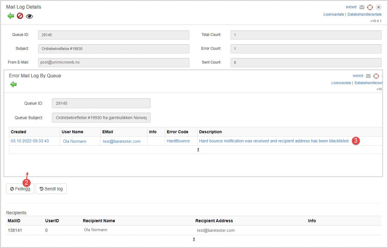 Dersom en e-post skulle feile, så logger systemet en beskrivelse på hvorfor e-posten ikke har blitt levert.