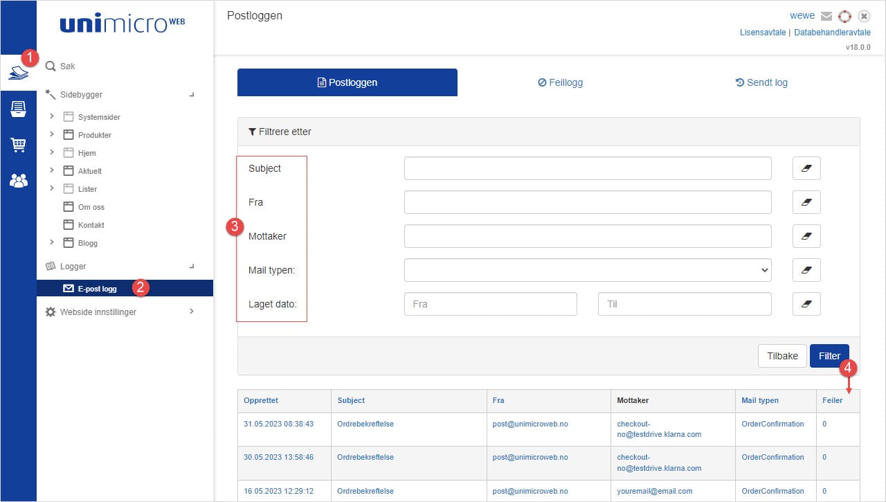 Alle e-poster som går ut fra nettbutikken kan man finne igjen i e-post loggen i nettbutikken: