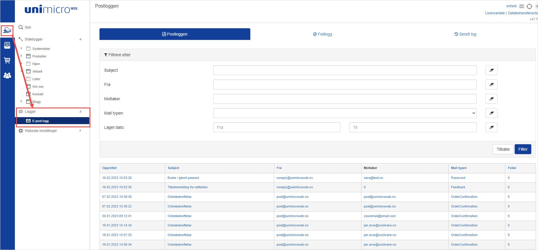 Gå fra sidebyggeren → Logger → E-post logg