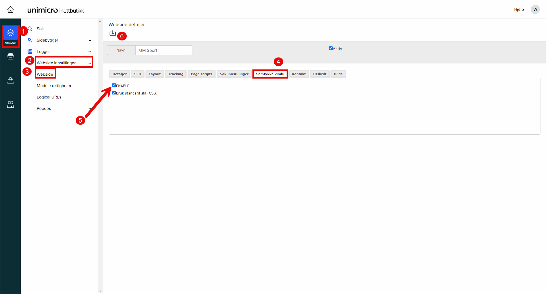 Gå til struktur - Webside innstillinger - Webside - Samtykke vindu - Huk av / fjern avhuking - lagre.