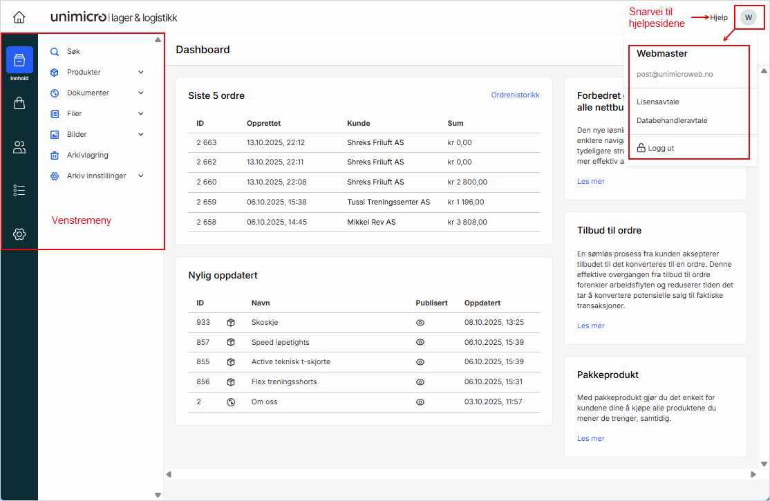 Startskjermen viser en oversikt over de siste ordrene, nylig oppdaterte produkter og viktige meldinger fra Unimicro. Dette gir deg rask innsikt i hva som skjer i nettbutikken din akkurat nå.