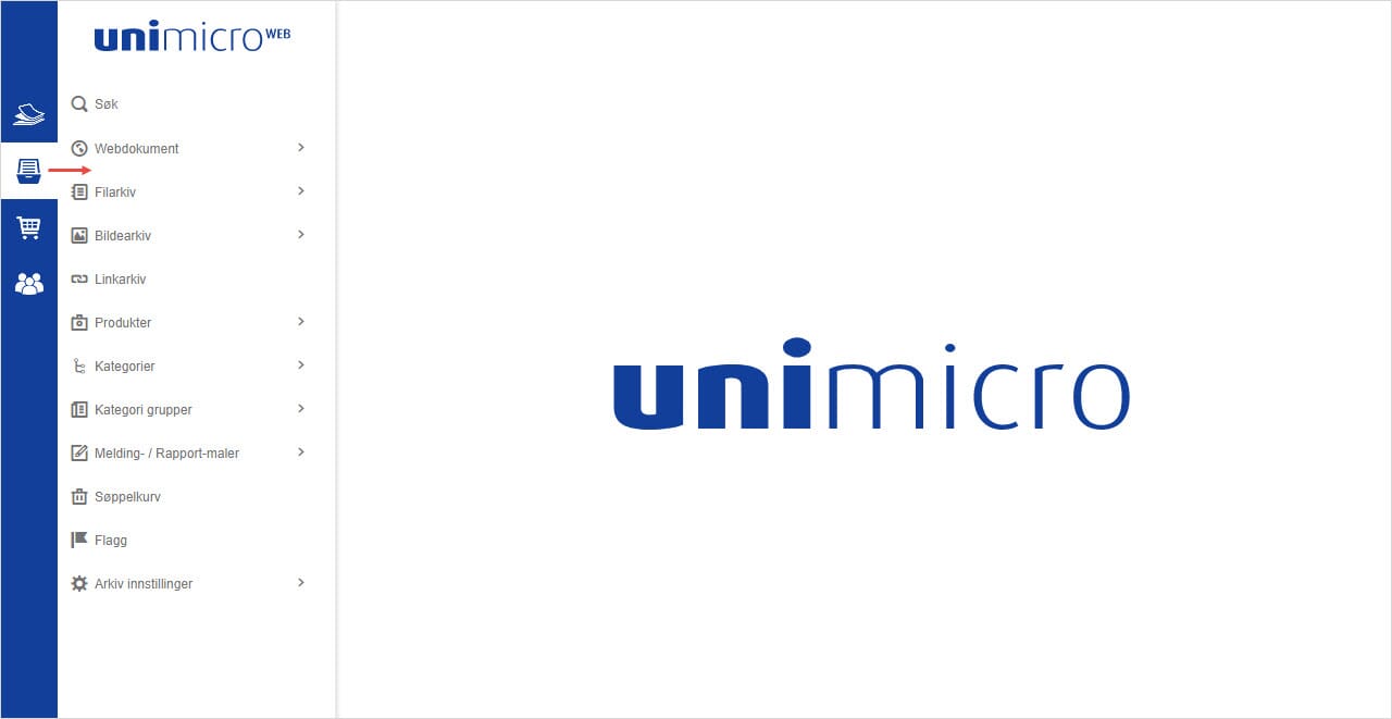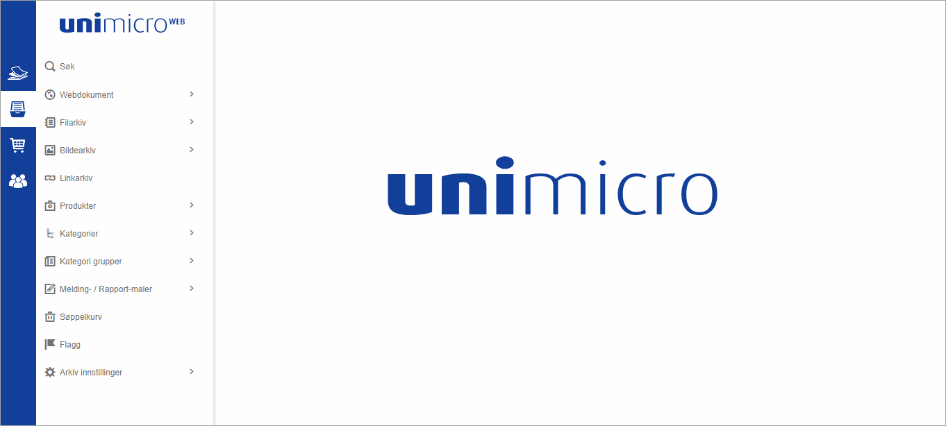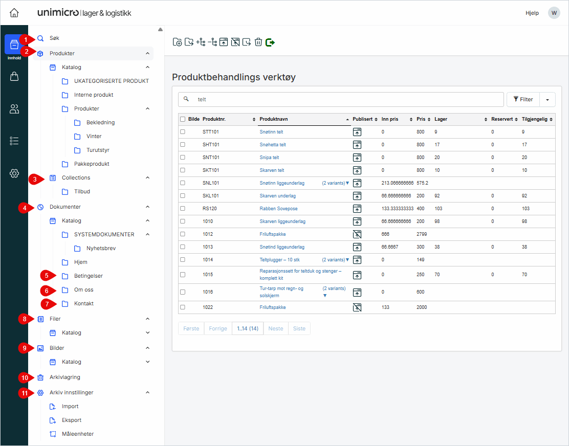 Her administrerer du produkter, dokumenter, filer og bilder. Du har også tilgang til arkivfunksjoner og import/eksport.