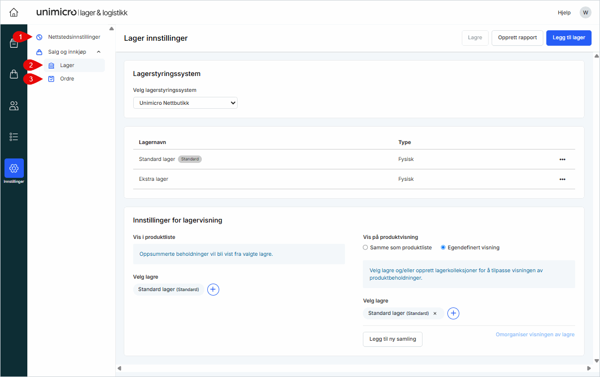 Her konfigurerer du lager, ordrehåndtering og visning. Du kan opprette flere lagre, justere visningsregler og aktivere funksjoner som trengs i din løsning.