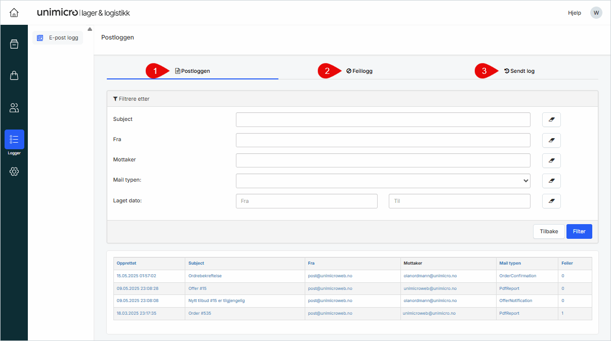 Under menyen Logger finner du oversikt over all utgående e-post fra løsningen, inkludert ordre- og tilbudsutsendelser. Dette brukes til kontroll og feilsøking.