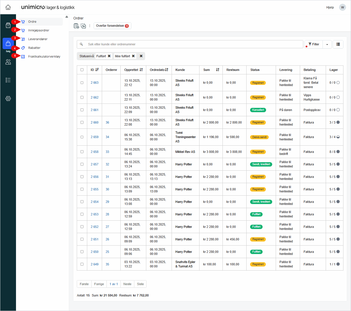 Ordre: Full oversikt med søk, filter og statuser.