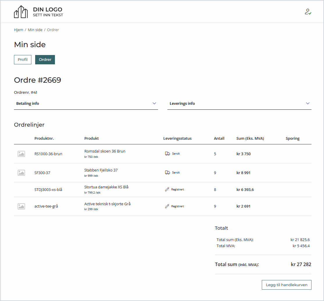 Ordrer - vises ordrehistorikk med full oversikt over tidligere bestillinger.
