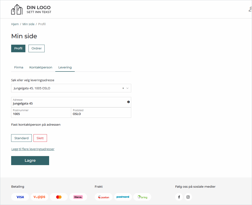 Profil - er delt i tre underfaner: Firma, Kontaktperson, og Levering.
