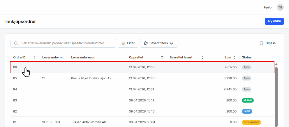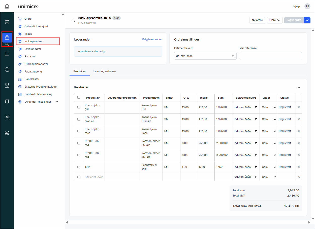 Systemet oppretter én innkjøpsordre som inneholder alle de valgte produktene. Innkjøpsordren åpnes. Du finner den under Salg → Innkjøpsordrer i venstremenyen.