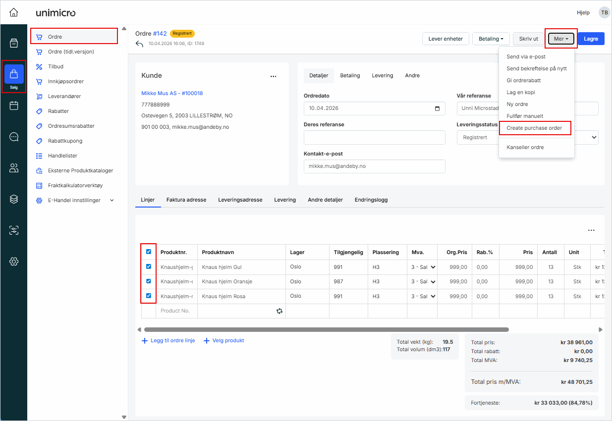 2. Åpne ordren du vil opprette en innkjøpsordre fra