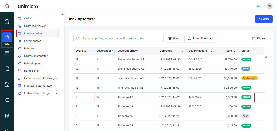 1. Gå til Salg i venstremenyen og klikk på Innkjøpsordrer