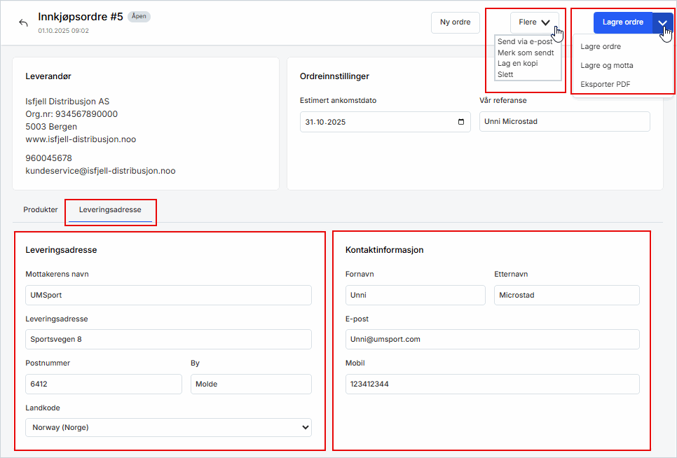 3. Klikk på pilen ved Lagre ordre og velg ønsket handling: