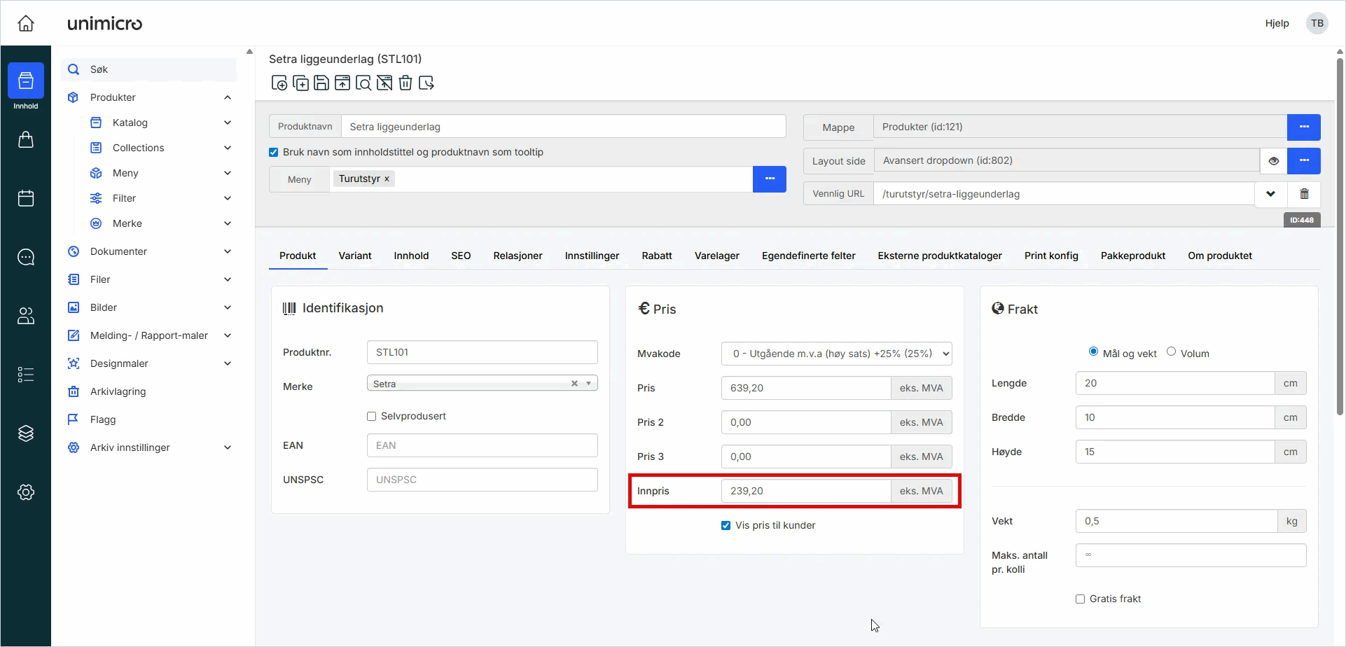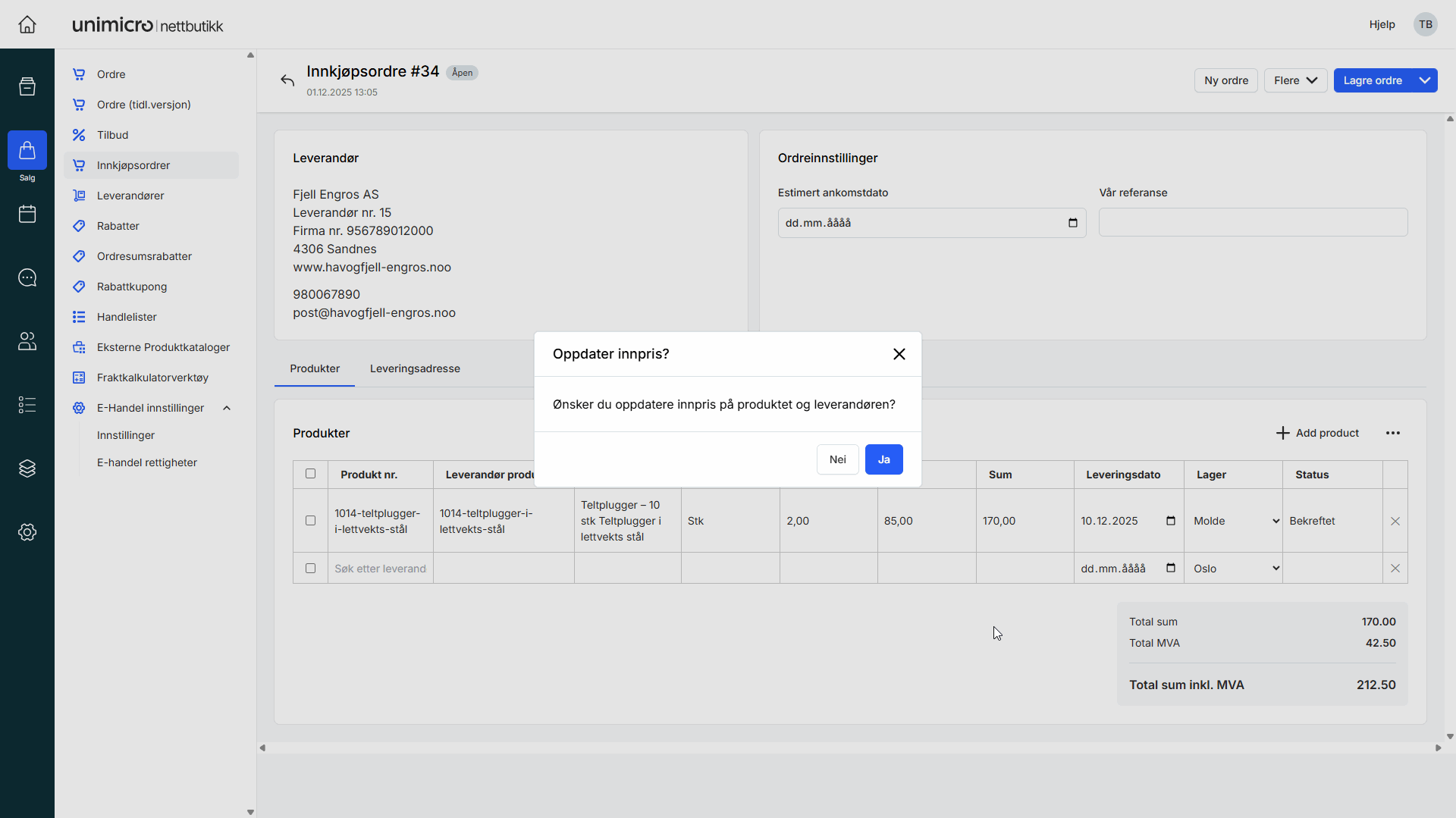 Innkjøpsprisen kan holdes ajour og oppdateres automatisk fra bestillinger. Dette gjøres ved å godkjenne at produktets innkjøpspris hentes fra gjennomførte bestillinger.