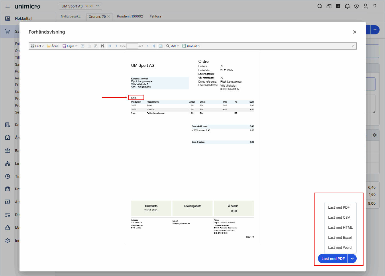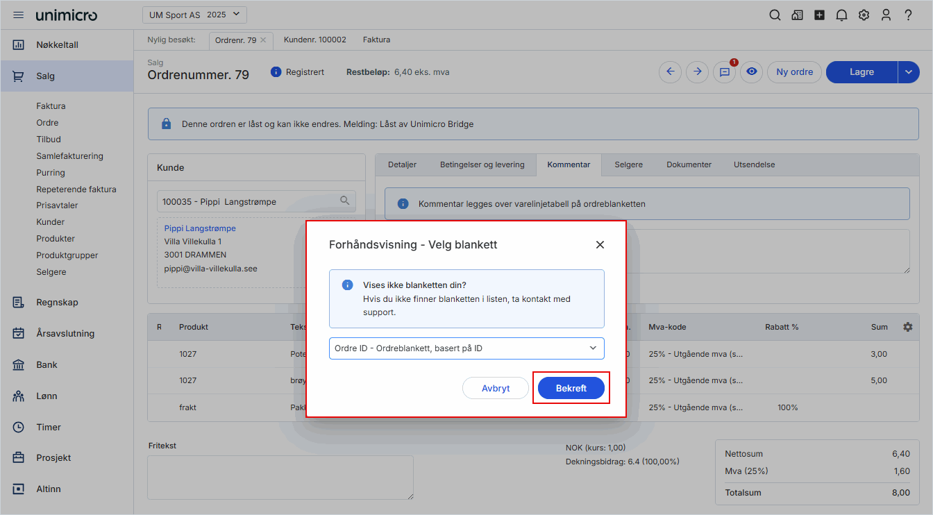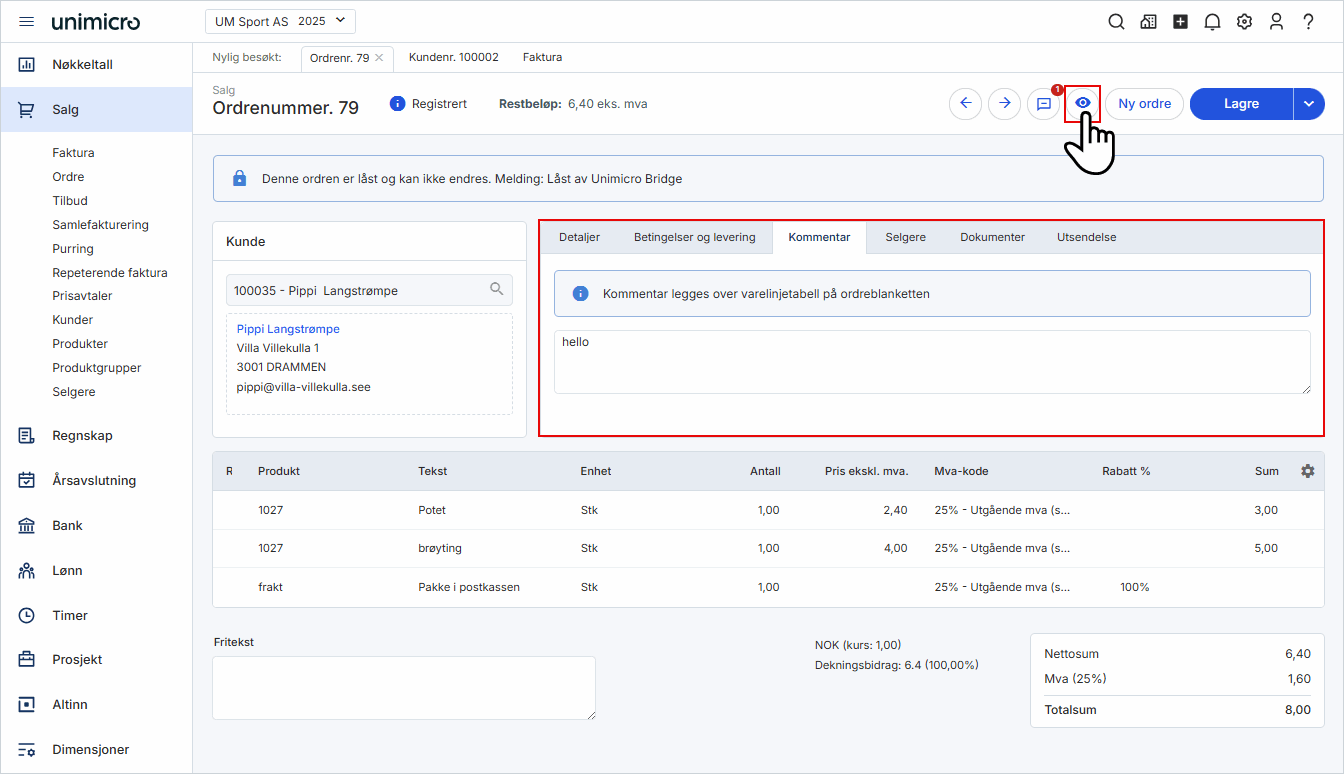 6. Klikk på ordrenummeret i toppmenyen for å åpne regnskapet