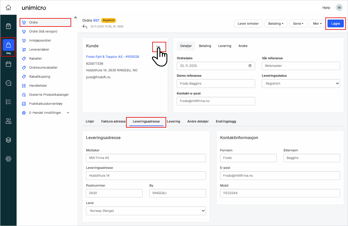 Hvis leveringsadressen eller kontaktinformasjonen på en ordre er feil eller mangler. Du må i laste inn kunden på nytt. Dette sikrer at all informasjon hentes korrekt fra kundekortet og at historikken blir riktig.