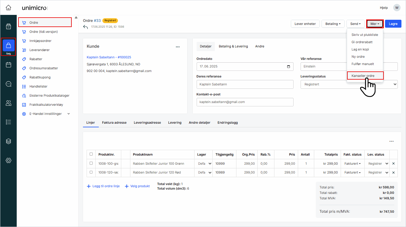 Ordren får nå status Kansellert. Statusen vises i grønt for å markere at du ikke har flere handlinger å utføre på ordren.