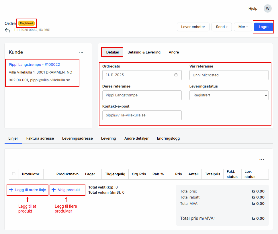 1. Klikk Lagre i toppmenyen. Nå blir ordren registrert i systemet, og status endres fra Ingen til Registrert.