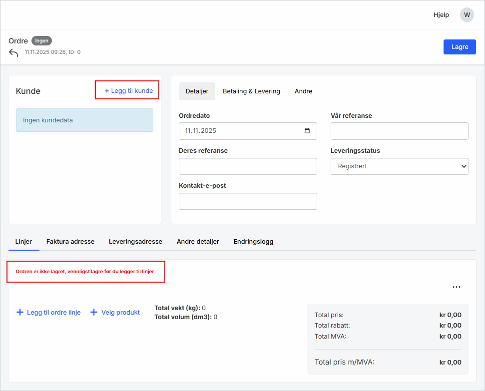Ordre er ikke lagret, vennligst lagre før du legger til linjer.