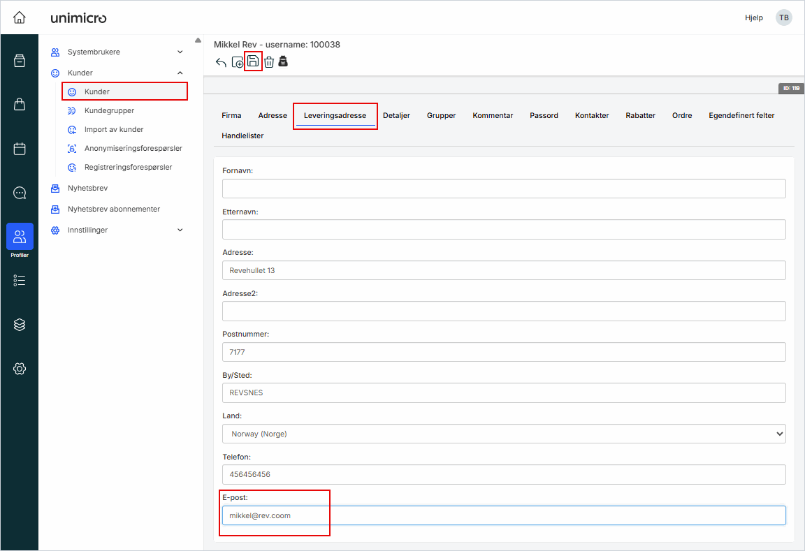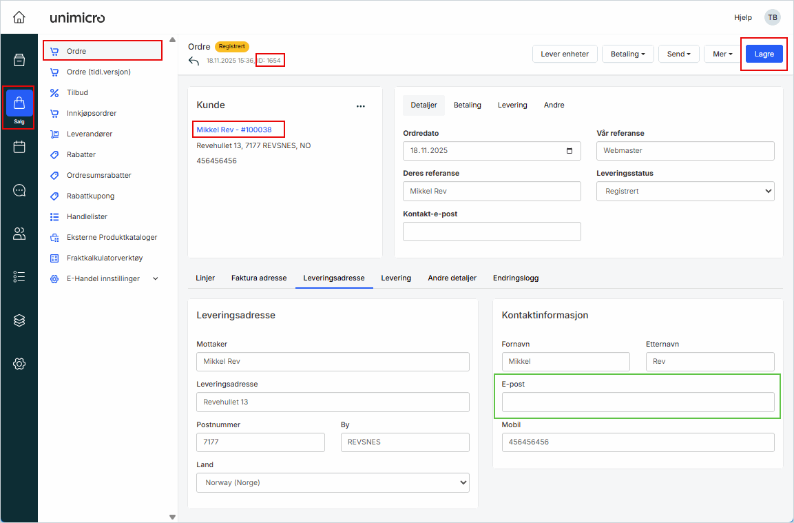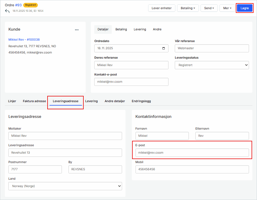 1. Klikk på Lagre i toppmenyen for å lagre ordren med de nye kundedetaljene