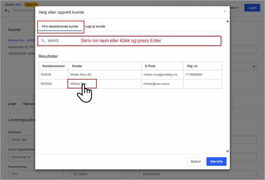 4. Skriv inn kundenavnet, eller klikk i søkefeltet og trykk Enter for å se alle kunder