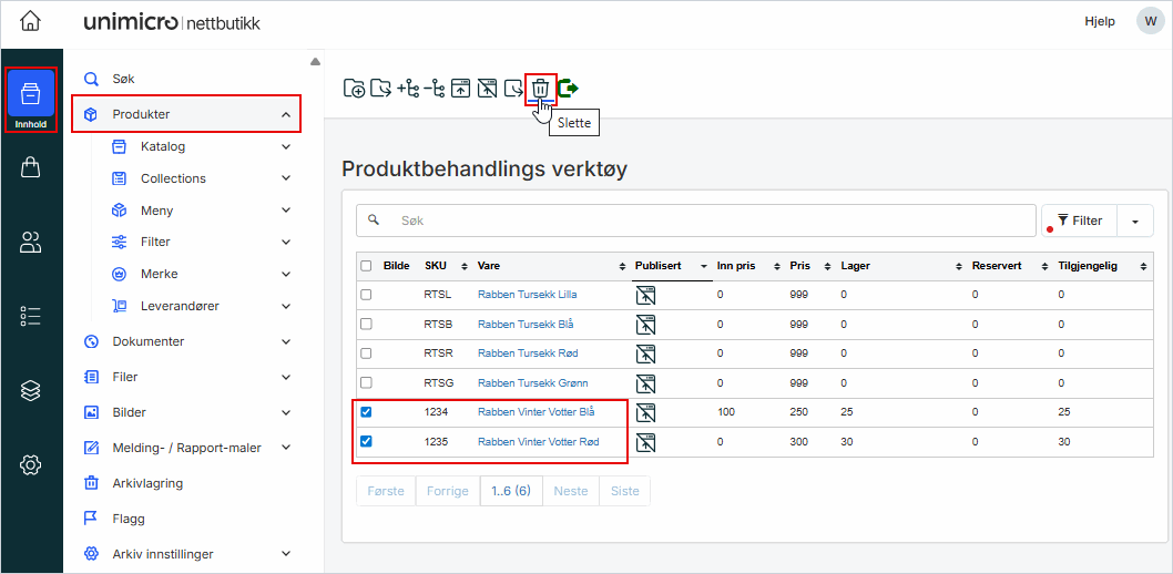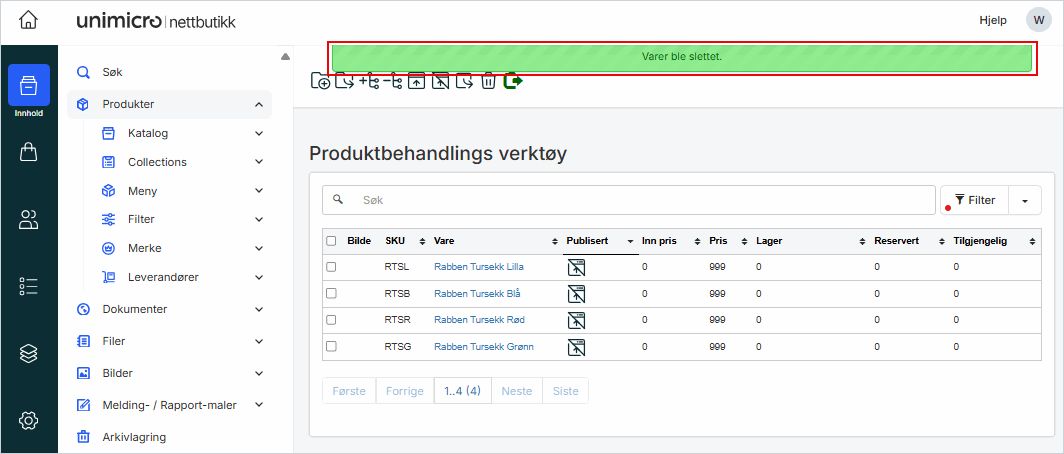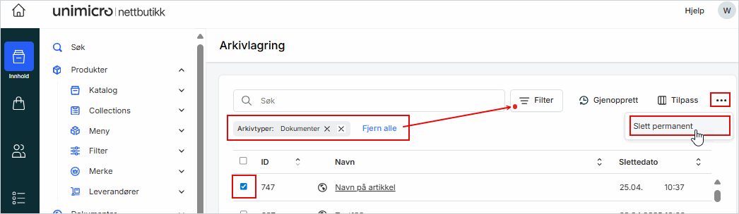 Når et produkt slettes fra Produktkatalogen, fjernes det fra nettbutikken og legges i Arkivlagring. Produktet kan fortsatt gjenopprettes derfra så lenge det ikke er slettet permanent.