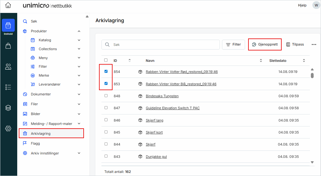 Hvis et produkt er slettet ved en feil, kan det gjenopprettes fra Arkivlagring.