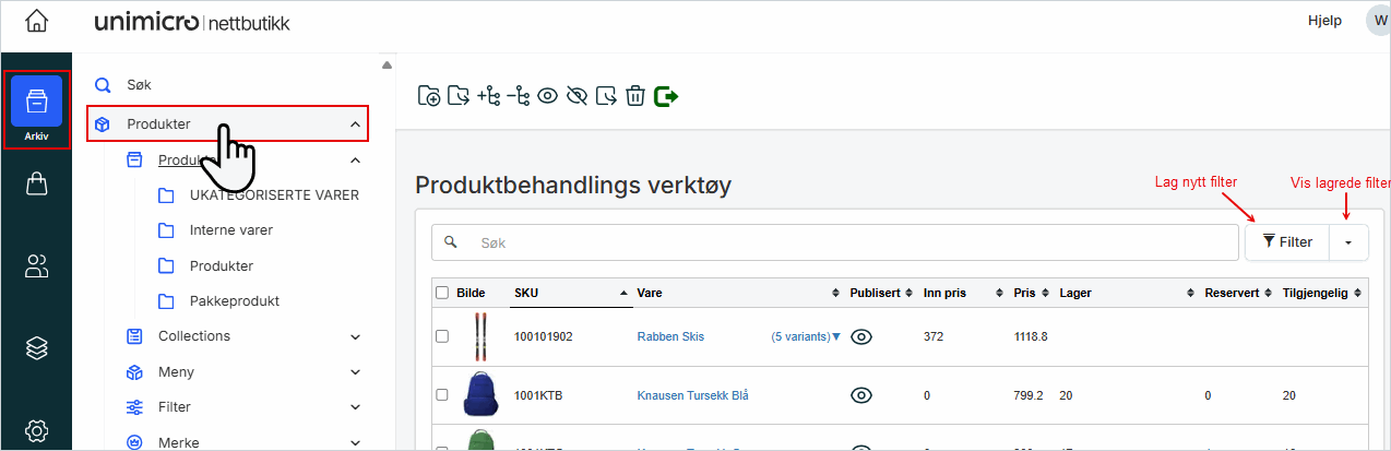 Filterknappen – viser alle kriterier du kan sette hake ved for å filtrere produktene