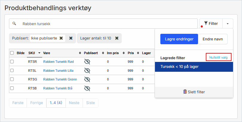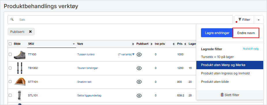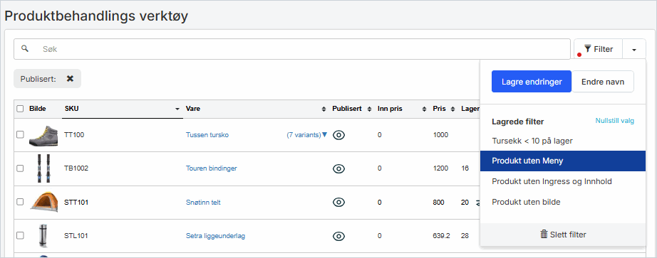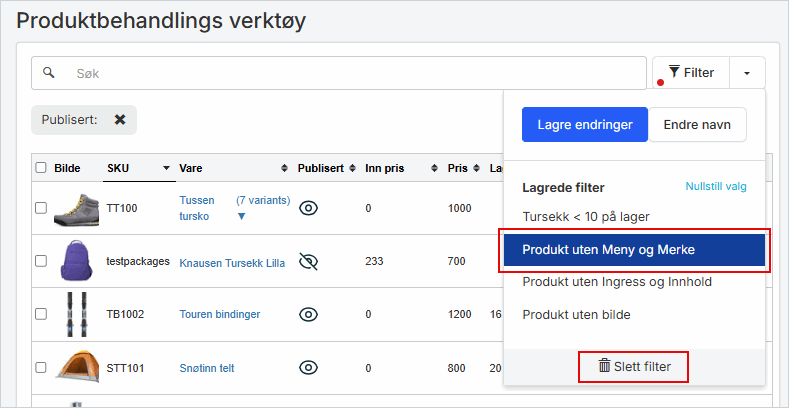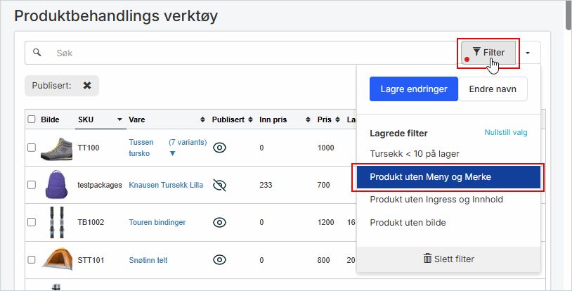 Dette er nyttig når du skal rydde opp etter import, eller sikre at alle produkter har nødvendig informasjon før publisering.