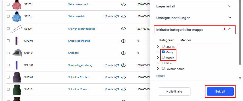 Dette filteret hjelper deg å finne produkter som mangler både meny-kategori og merke – nyttig for å rydde opp etter import.