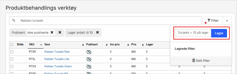 3. Skriv inn filter navn Tursekk < 10 på lager