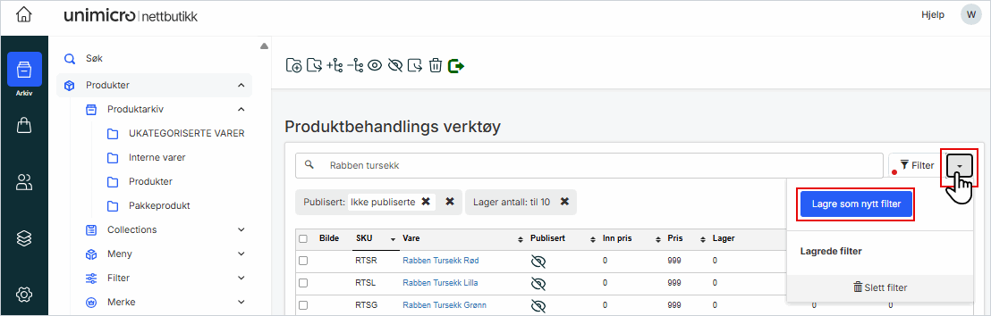 3. Eksempel: Opprett nytt filter for produkt uten meny og merke