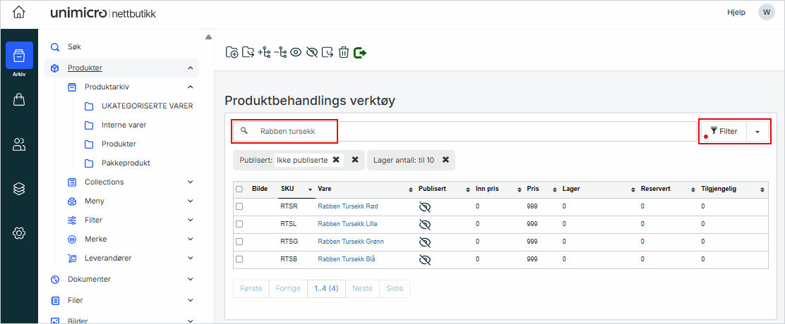 Eksempel: Finn produkter som ikke er publisert, har mindre enn 10 på lager og heter Rabben Tursekk.