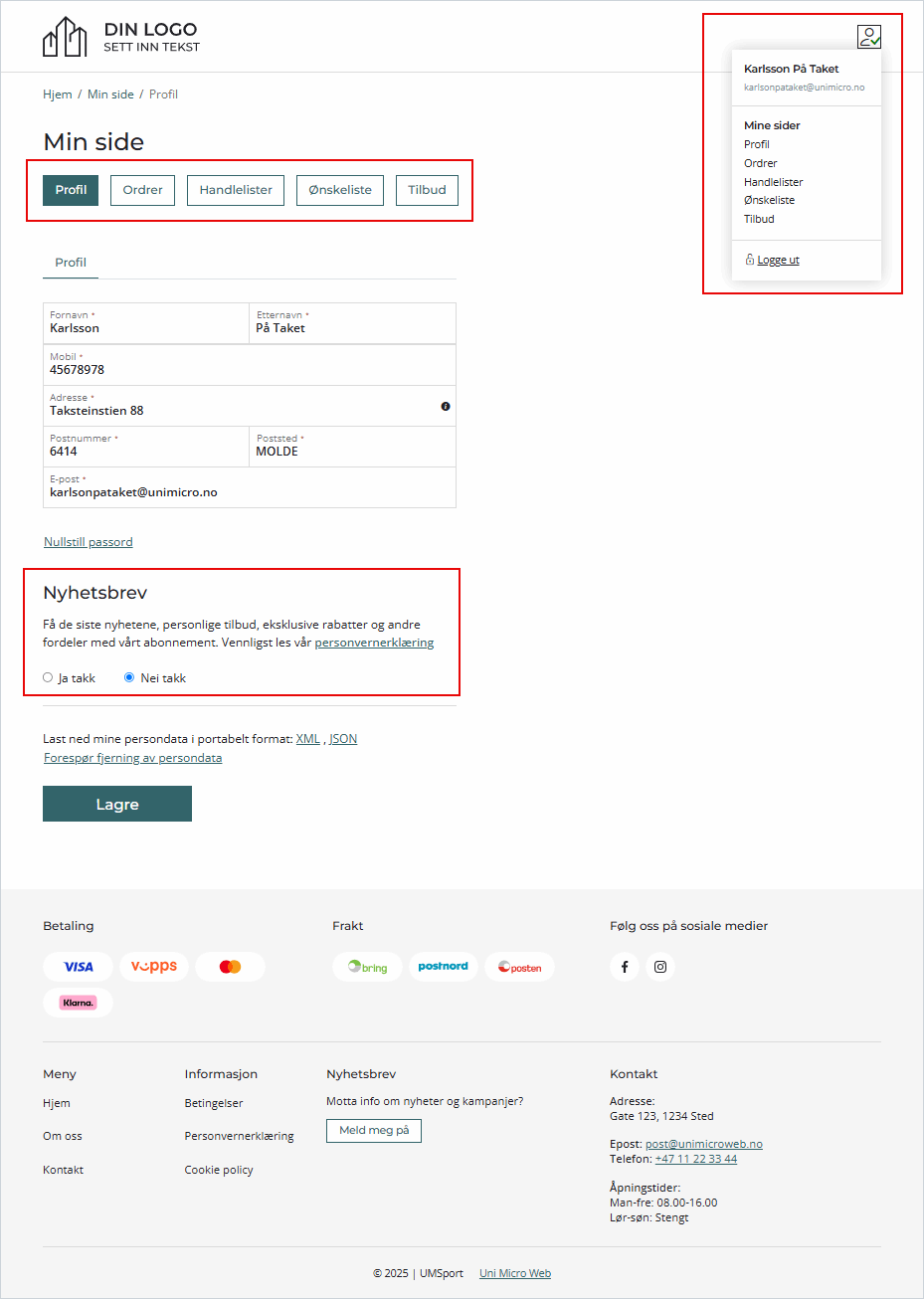 Profil: Endre kontaktinformasjon, adresse, passord og innstillinger for nyhetsbrev