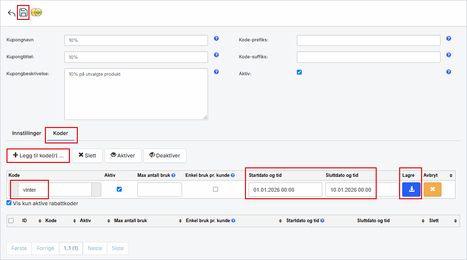 6. I startdato/sluttdato: Velg om koden kun skal brukes i en angitt periode