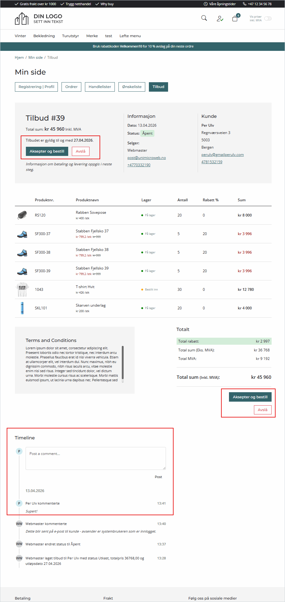 – Aksepter og bestill – Kunden aksepterer tilbudet og produktene legges i handlekurven