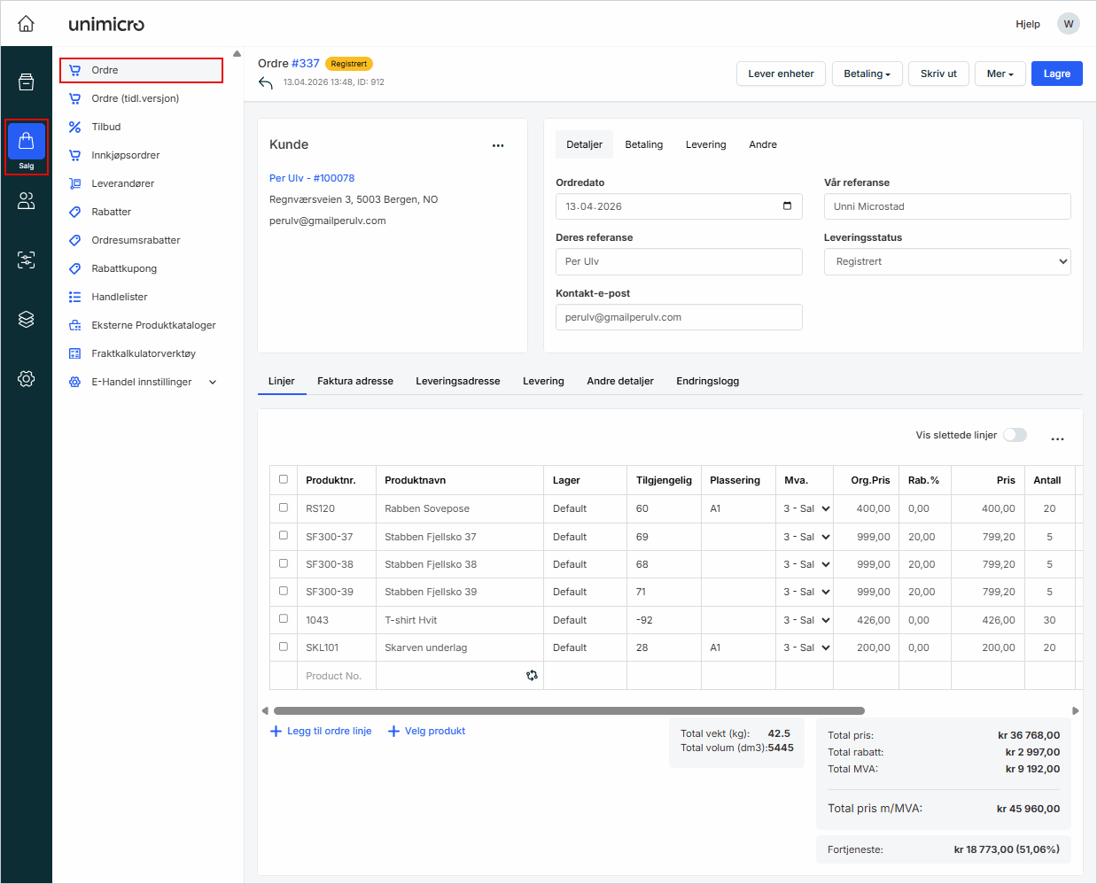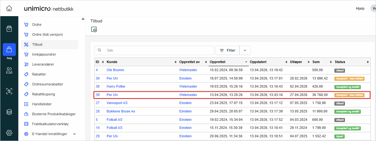 Systemet oppretter en ordre basert på tilbudet. Ordren åpnes under Salg → Ordre i venstremenyen, med alle produktene, prisene og kundeinformasjonen fra tilbudet.