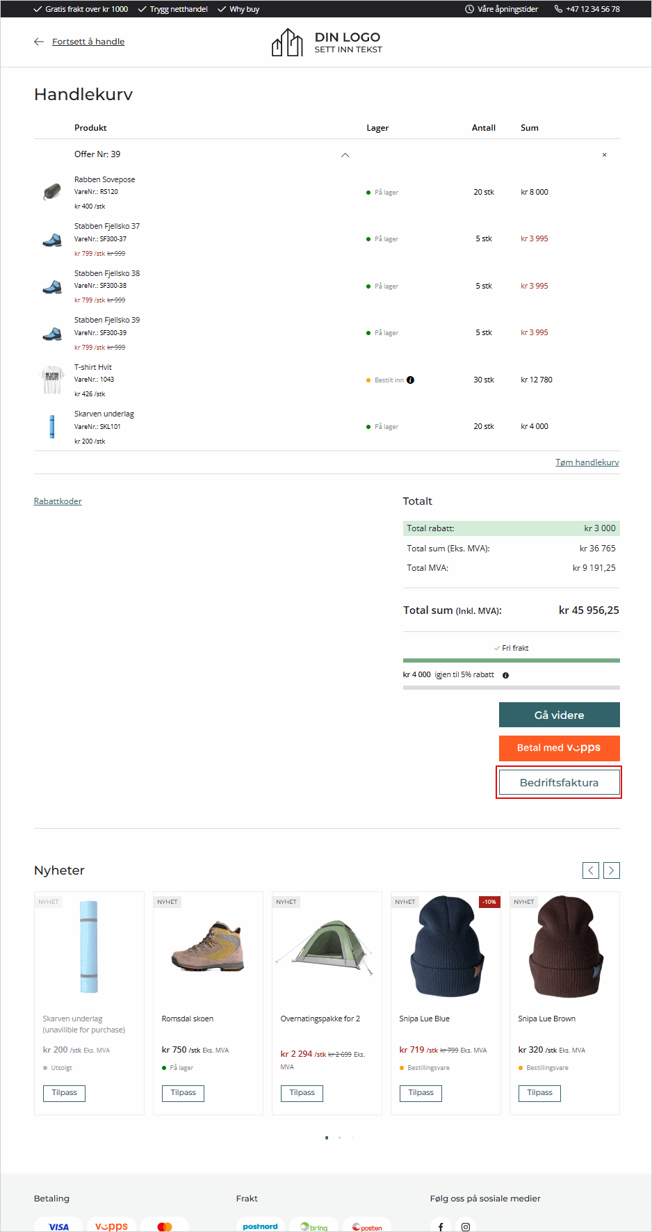 Etter at kunden har akseptert tilbudet, åpnes handlekurven med produktene fra tilbudet. Kunden velger betalingsmåte og fullfører bestillingen.