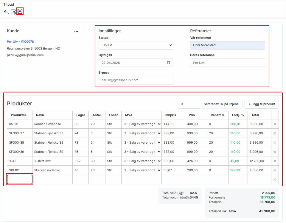 Tilbudet åpnes med kundeinformasjonen allerede fylt inn.