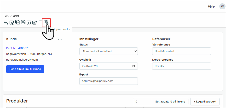 9. Opprett ordre fra tilbudet